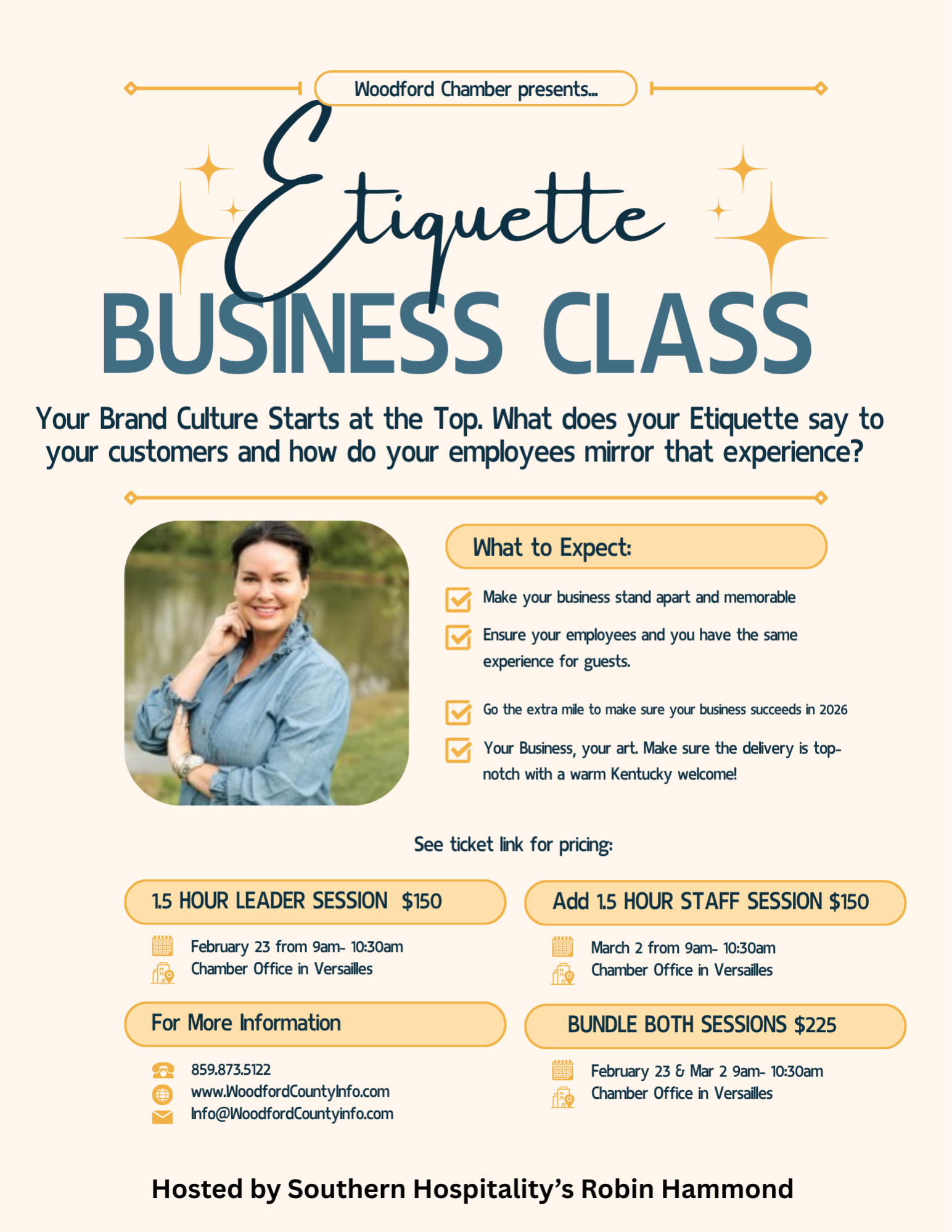 $150 per person Session two (use this link to register for this session-Business Etiquette Class Session 2 March 2nd - Woodford County Chamber of Commerce )