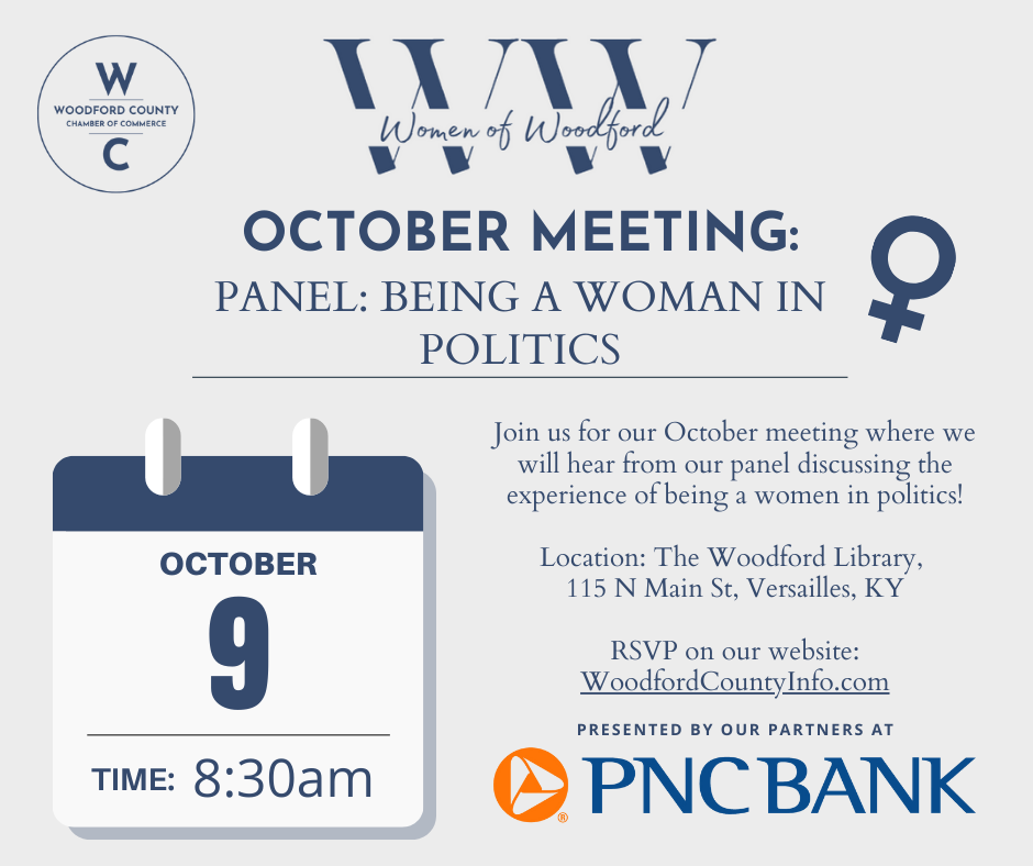 Join us at our monthly Women of Woodford meeting! Hear from our special panel of woman at the Woodford Library the morning of October 9th discussing what it's like to be a woman in politics. This will be an empowering conversation you won't want to miss!