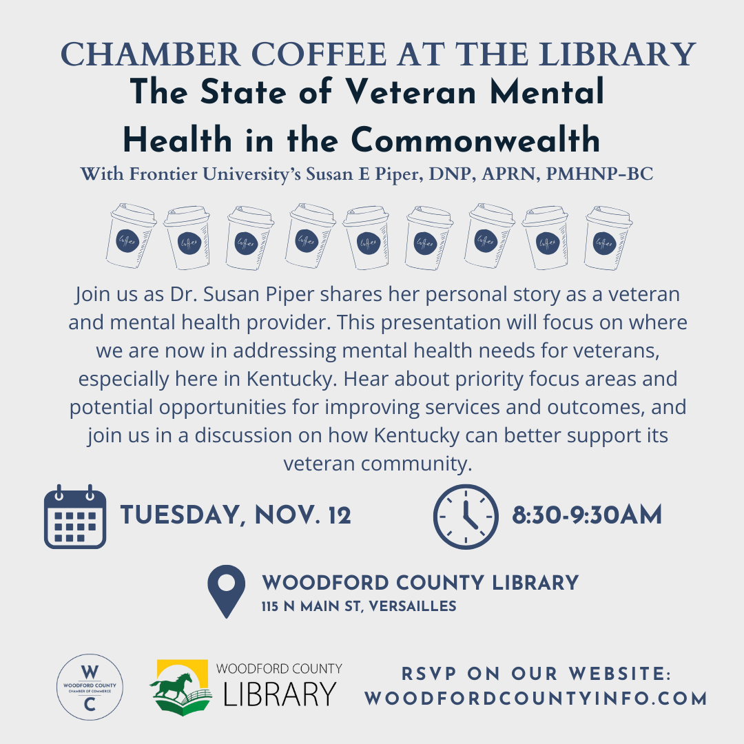 Join us for our monthly Chamber coffee at the library! This month, our Chamber Health and Wellness Roundtable group will be bringing in Dr. Susan Piper to discuss 'The State of Veteran Mental Health in the Commonwealth'.
