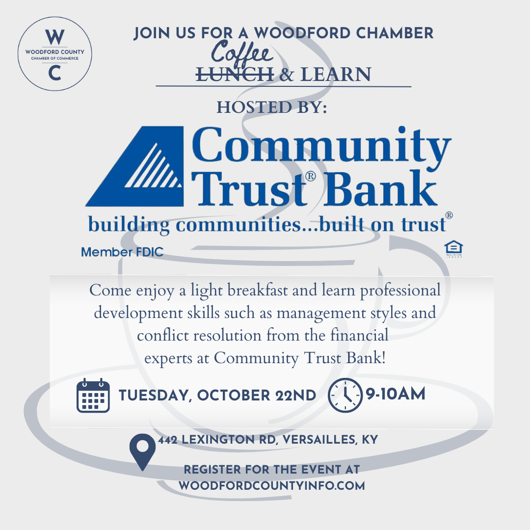 A re-scheduling of last Month's Lunch and Learn cancelled due to weather conditions! Come enjoy a light breakfast and learn professional development skills such as management styles and conflict resolution from the financial experts at Community Trust Bank!