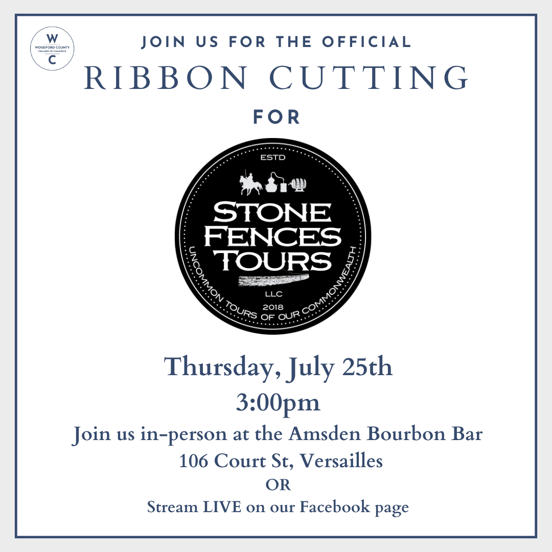 Join us in welcoming Stone Fences tours to the Woodford County Chamber of Commerce with an official ribbon cutting ceremony! Hosted by the Amsden Bourbon Bar in downtown Versailles.